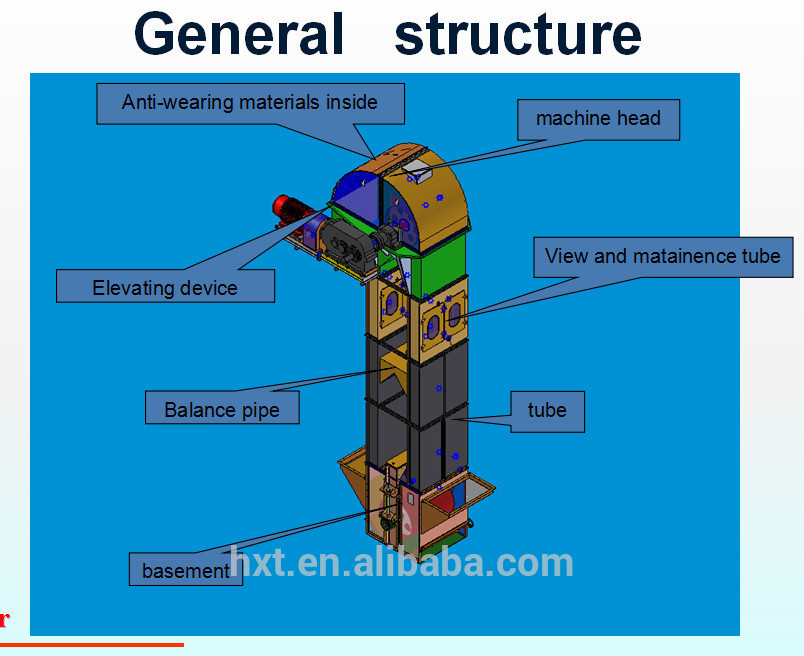本機適用于糧食、肥料、飼料等行業顆粒狀或粉狀物料的垂直輸送。具有提升穩定、占地面積小、提升度高、密封性能好等優點。
