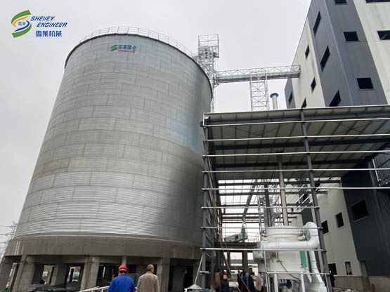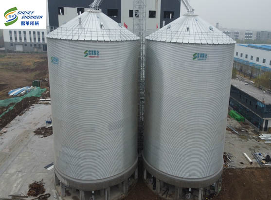 平底鋼板倉,直徑16.5米,層數16層,倉檐高17.975米,總高21.81米,容積4119m³;鋼板倉錐頂角度25度。全部鍍鋅板采用國產優質鍍鋅鋼板,鍍鋅層均為275g/㎡。倉頂蓋板為δ1.0mm熱鍍鋅板,選用國產優質熱鍍鋅板,倉頂上設置自然通風窗、人孔、爬梯,倉頂用航空膠泥和防水墊圈密封,沿倉檐四周設有安全防護欄。
