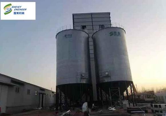 此項目為2臺500T全鋼錐底鋼板倉,項目工作流程為糧食經(jīng)卸糧坑進到提升機,提升機配合電動三通的開合,通過離心力的作用將糧食輸送到鋼板倉中。